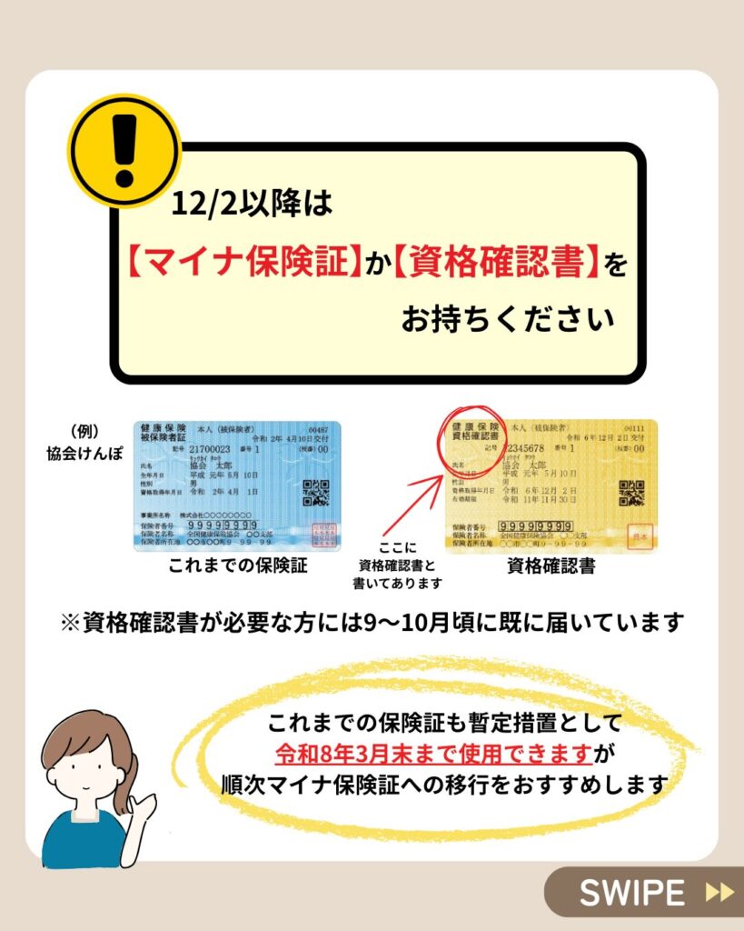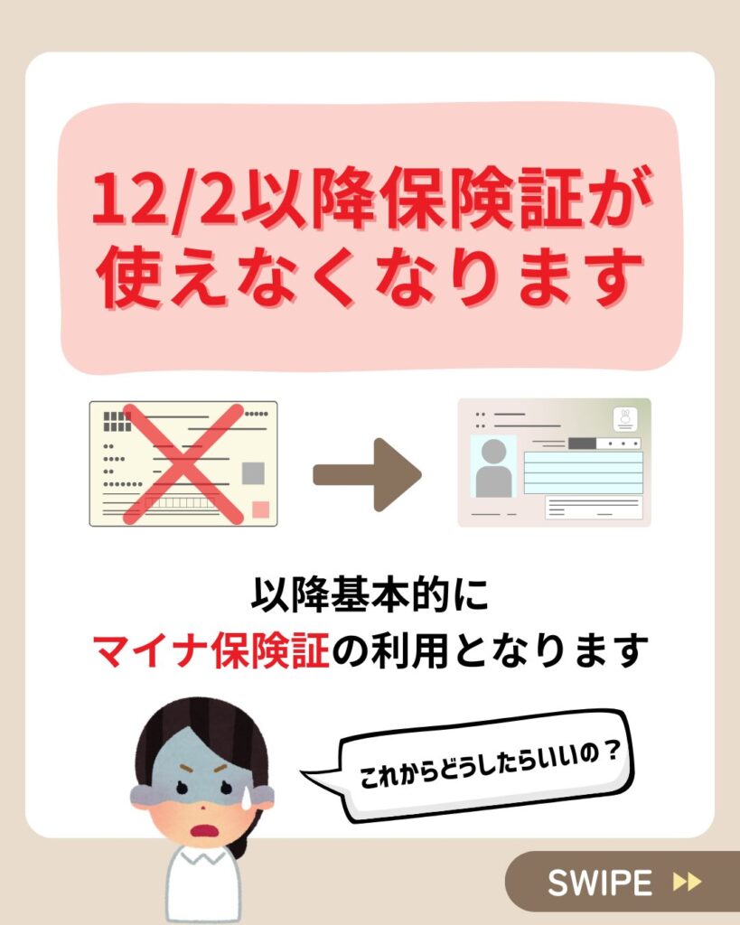 ご存知の方も多くいらっしゃるかと思いますが、12/2よりこれまでの健康保険証が使えなくなり、医療機関を受診する際には、「マイナ保険証」か、「資格確認書」の提示が必要になります。