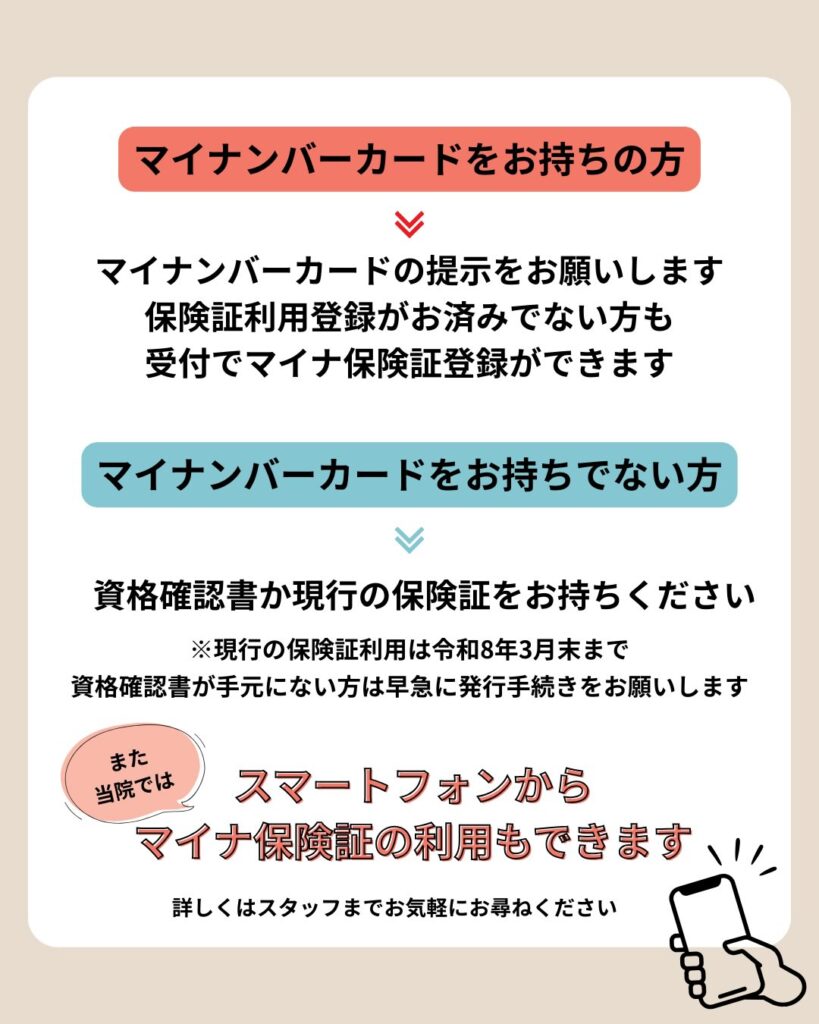 手続きが間に合わずこれまでの保険証をお持ちいただいた方も、令和8年3月末まではこれまで通り受診できますが、来年3月までの暫定的な対応ですので、順次マイナ保険証への移行をおすすめします😌