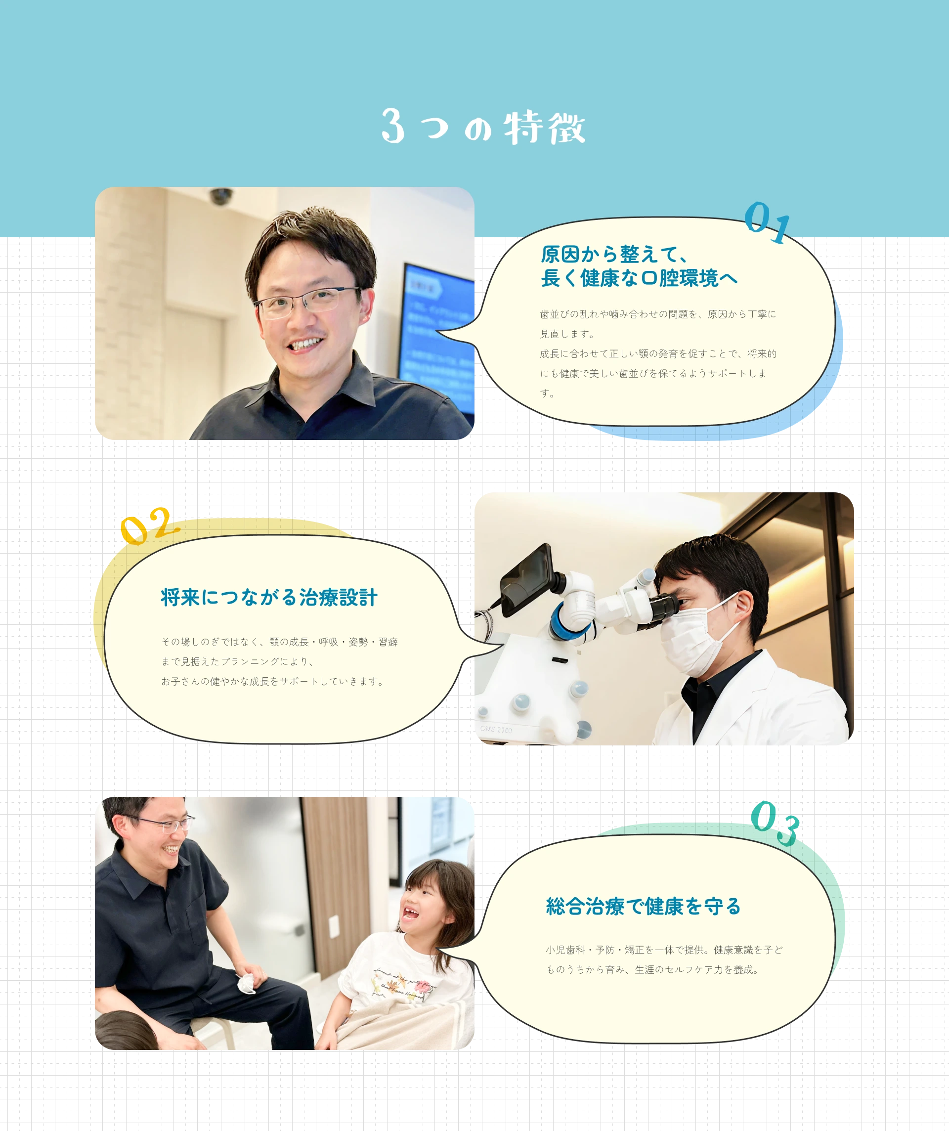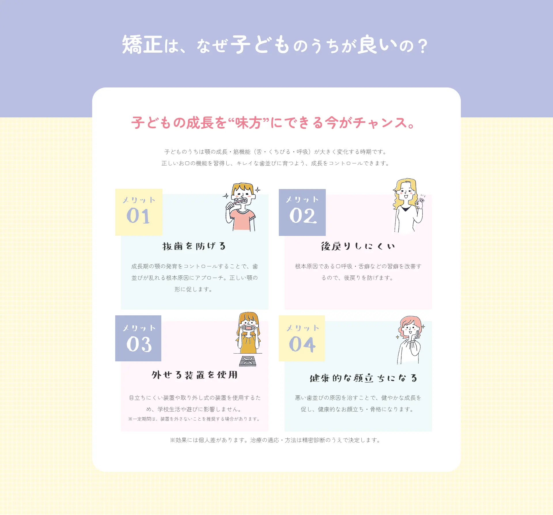 マウスピース型カスタムメイド矯正装置(スマーティー)を使った矯正治療は、歯並びや咬み合わせの改善だけでなく、顎の成長誘導を行う治療法です。