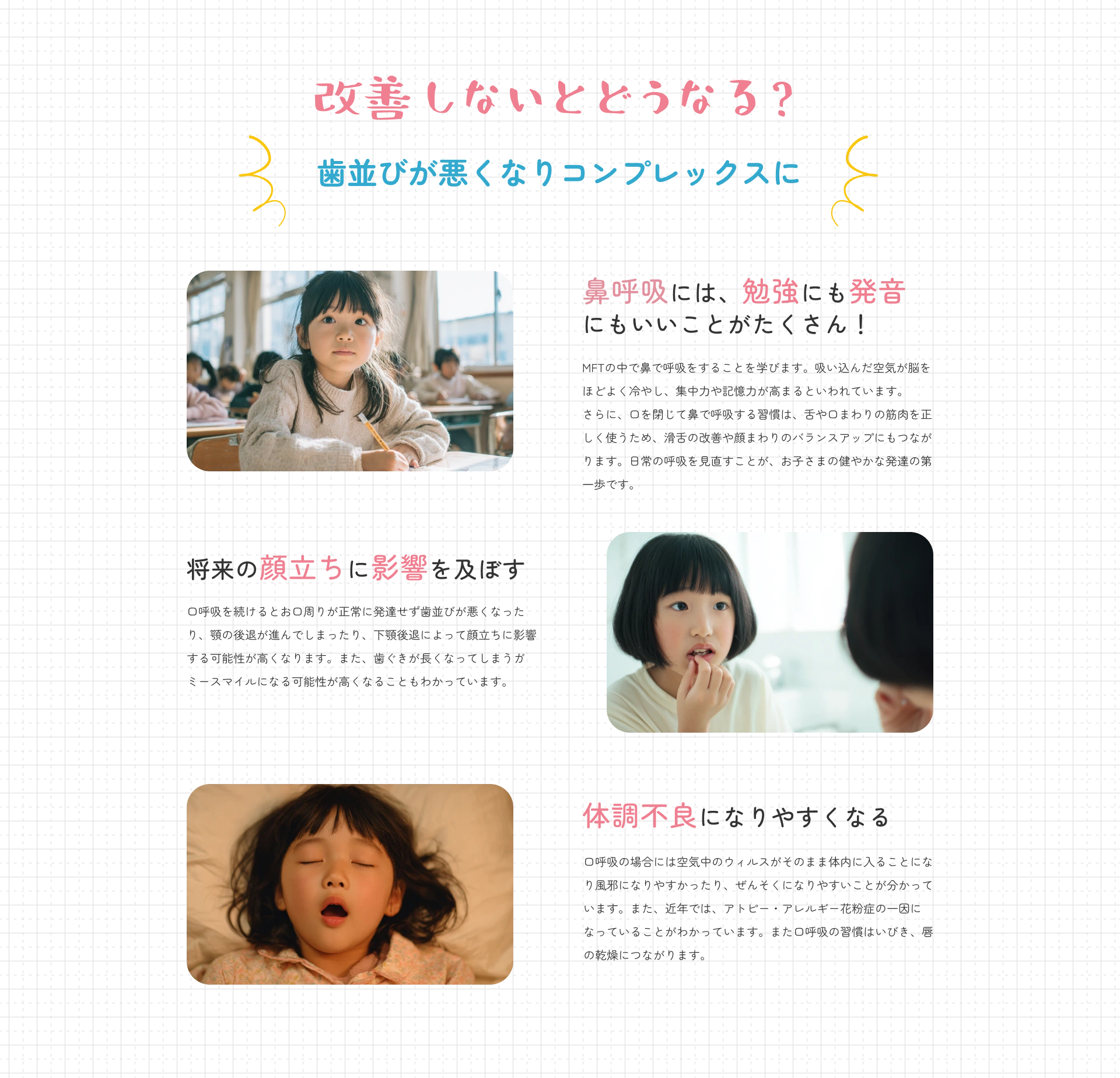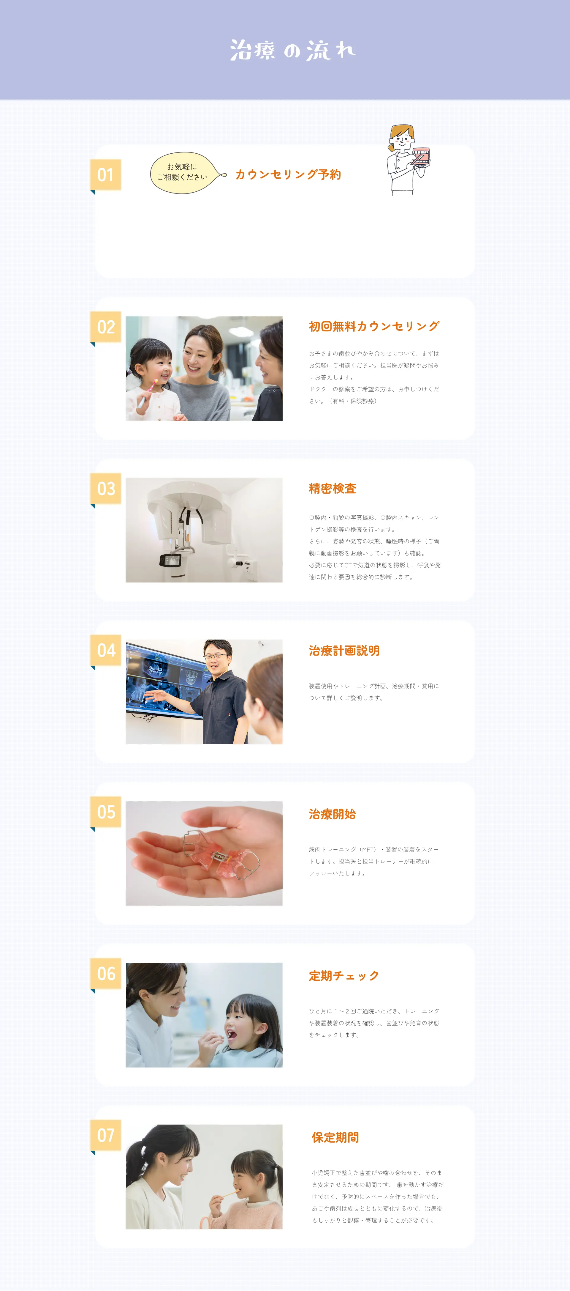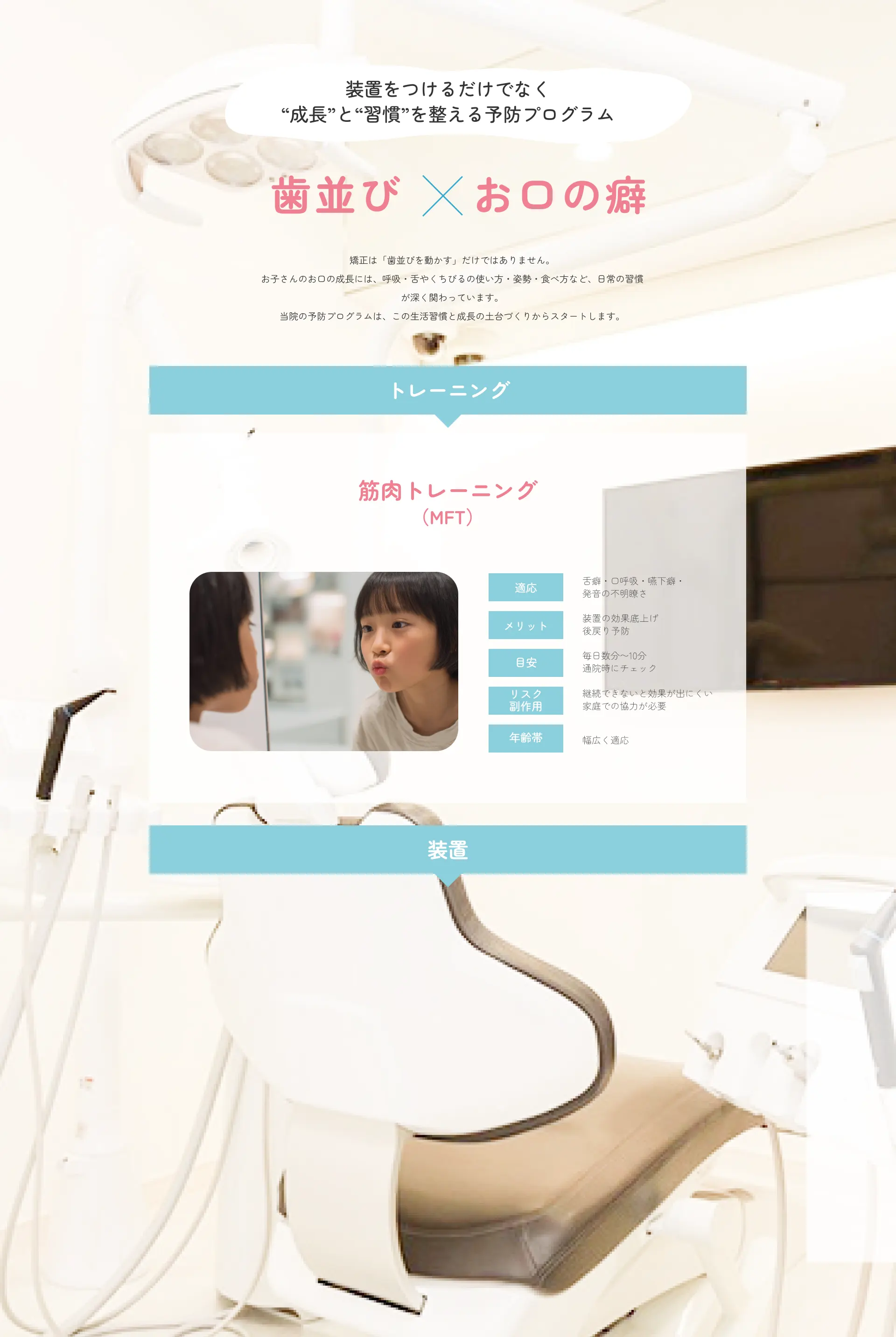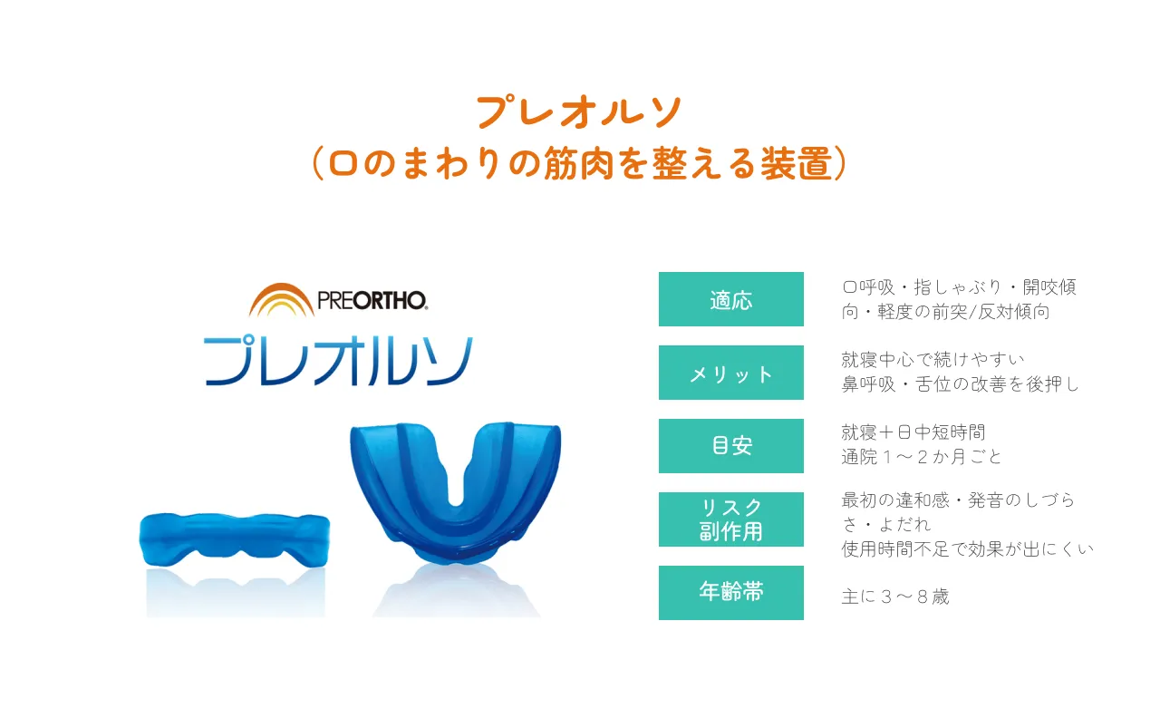 歯列矯正用咬合誘導装置(プレオルソ)は、歯を直接的に動かす一般的な矯正ではなく、 お口周りの筋機能(口腔周囲筋)を鍛える治療です。