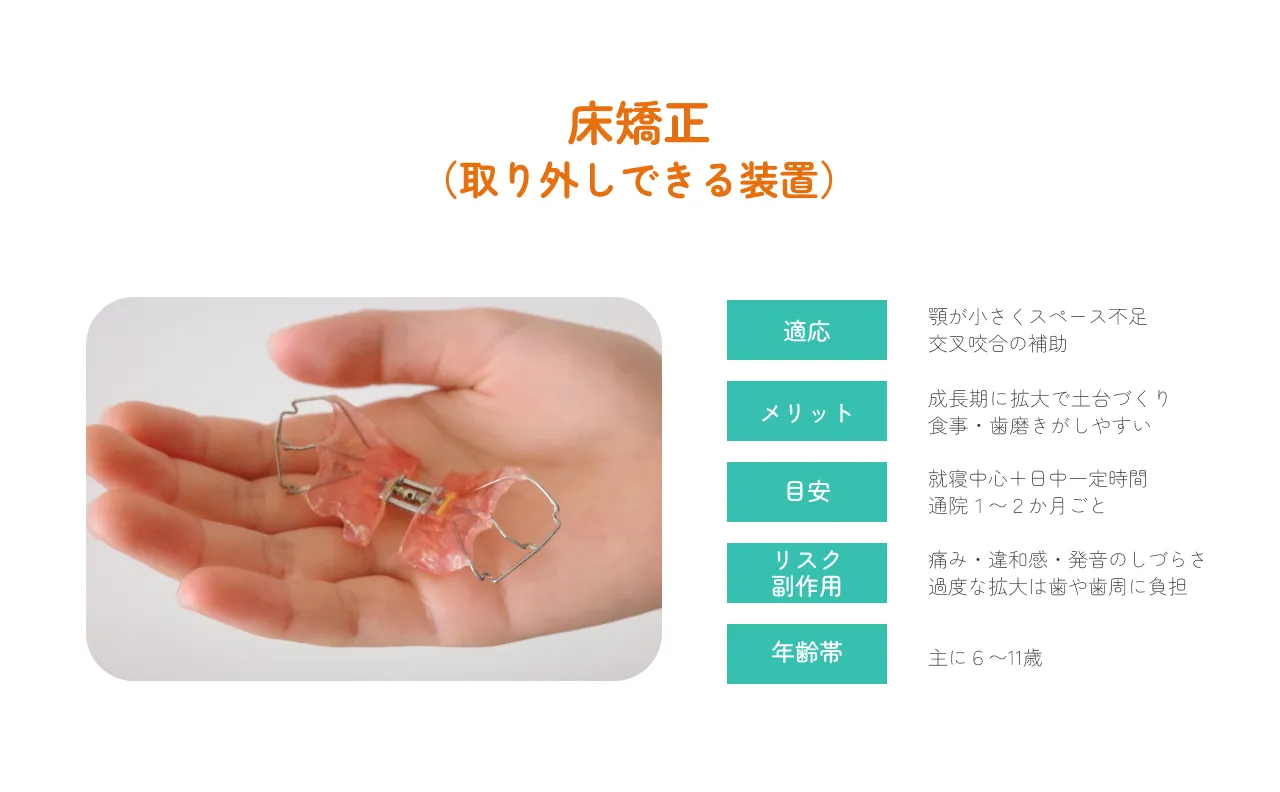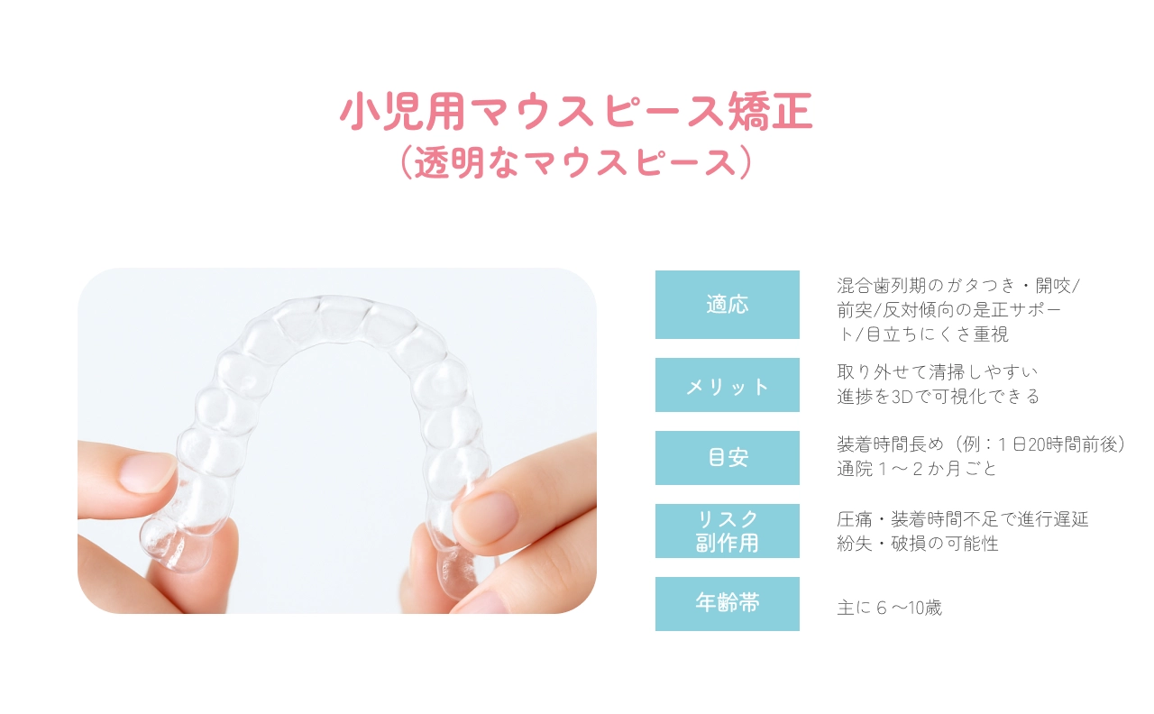 マウスピースを装着して、顎骨の成 長を阻害する口呼吸や舌の位置を正常に補正し、 永久歯がきれいに生えるスペースを確保します。